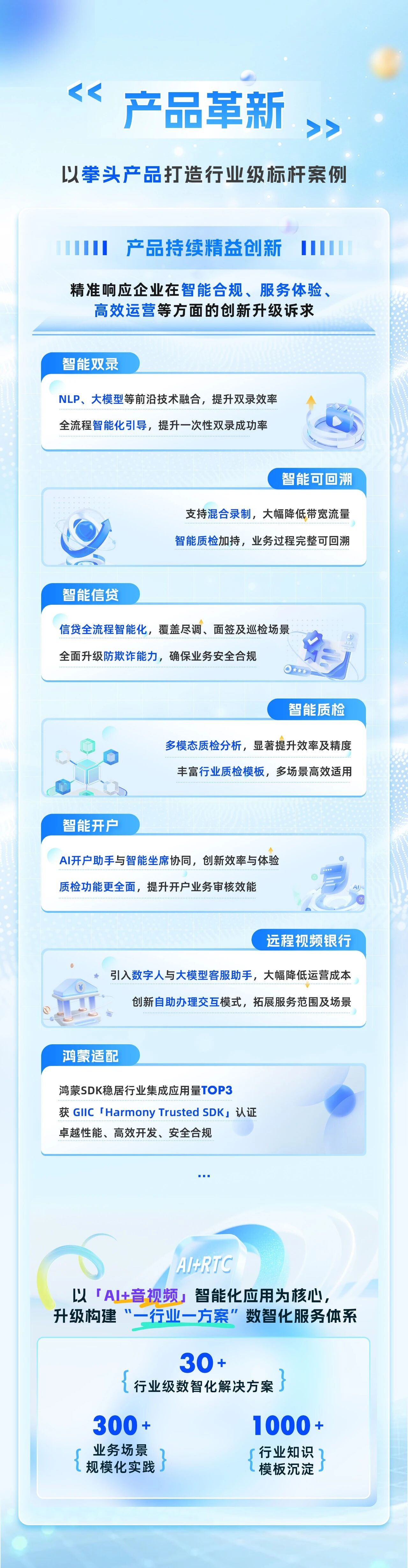 这一年,佰锐科技以国产化技术为基石,在「AI+音视频」战略规划下,对旗下AnyChat产品线进行深度智能化升级,全方位精进智能双录、智能可回溯、智能质检、智能开户、远程视频银行及智能信贷等拳头产品,持续夯实覆盖智能合规、高效运营与服务升级等领域的智能化产品矩阵,并在此基础上成功打造出多个技术与业务深度融合的客户口碑标杆案例,切实助力企业探索AI驱动音视频业务创新的新路径,加速构建智能原生新业态。