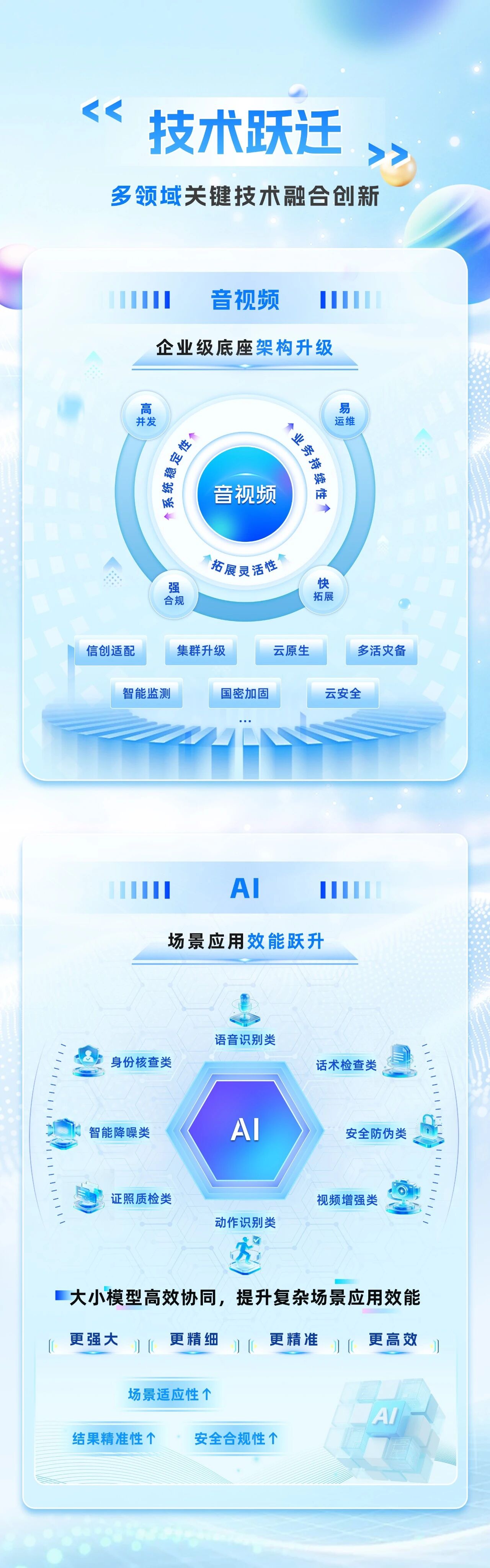 在智能音视频技术体系的构建中,面对众多企业当下业务快速扩张、高效运营及稳定安全的差异化需求,全面升级底层平台架构,从安全、运维、云原生、信创兼容等维度系统性提升底层架构的高并发、强合规、快拓展以及易运维能力,为各行业构建高品质、全场景的音视频服务体系提供坚实的支撑。