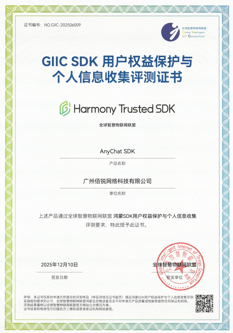 近日,在全球智慧物联网联盟(GIIC)主办的“鸿蒙SDK用户权益保护与个人信息收集评测”活动中,AnyChat SDK凭借卓越的合规架构与安全隐私保护能力,首批通过权威评测,获得「Harmony Trusted SDK」认证。