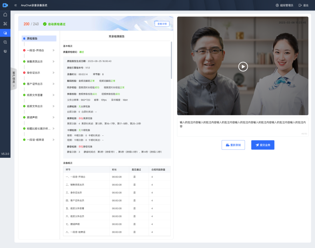 通过业务实时与准实时质检双重赋能,能够帮助业务审核人员快速精准判断选择是现场补录或是直接提交上传,极大提升双录的一次性通过率,并全面满足可回溯管理及监管抽查要求。