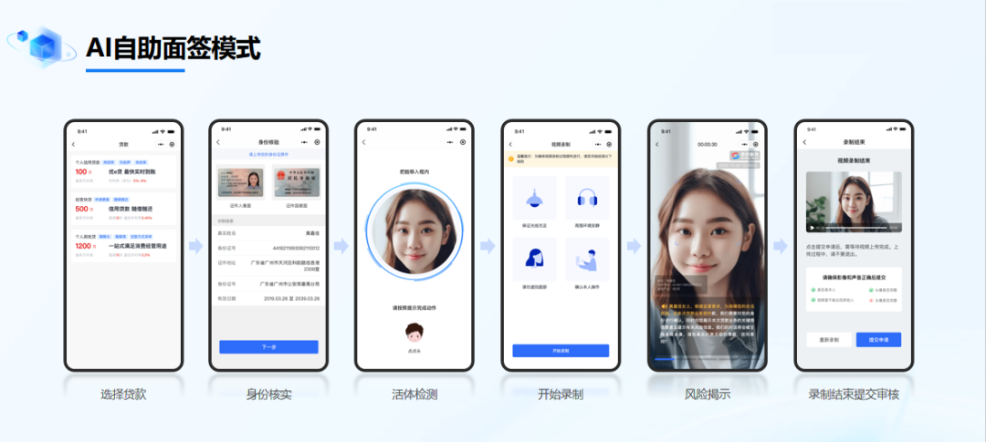 针对小额贷款业务,提供AI自助面签方式,无需坐席见证,客户在移动终端上即可快速根据业务后台设定的业务流程完成面签,全流程自助化,既能够节约人力投入成本,又能延长银行服务时长,智能便捷的服务体验有利于提升客户申贷意愿。