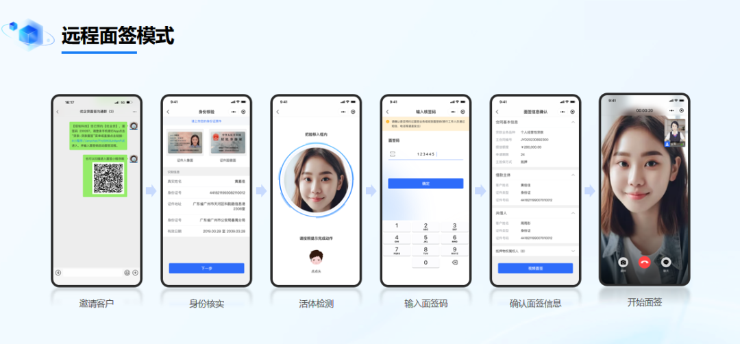 远程面签模式下,客户可通过预约面签(业务经理将面签码通过短信、微信、二维码等形式发送给客户,客户输入面签码即可进入远程面签),或排队面签(客户通过APP、微信小程序等渠道发起远程视频面签需求,业务系统通过智能排队、智能派单功能分配业务经理)等方式与银行业务经理进行视频智能交互,快速便捷完成身份真实性确认、意愿核实、合同在线阅读及签署等面签流程。