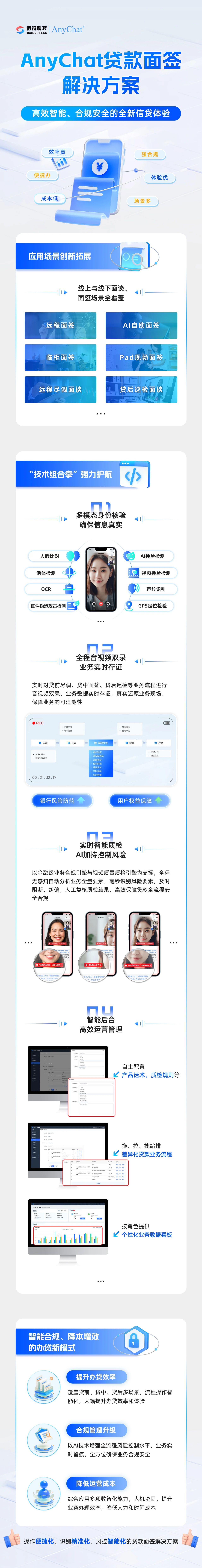 AnyChat贷款面签解决方案,通过全客户、全流程、全场景覆盖,实现对信贷业务标准化、统一化的全方位管控,助力银行机构快速落实监管要求、夯实风险管理能力、升级服务体验,为新阶段银行信贷业务的高效运营提供有力支撑。