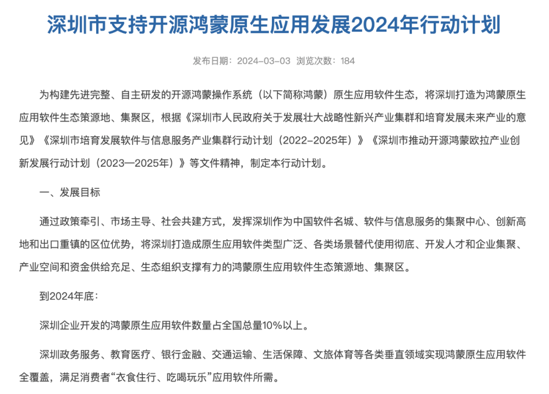 该《行动计划》是全国首个针对鸿蒙原生应用发展的政府行动计划,明确到2024年底,深圳企业开发的鸿蒙原生应用软件数量占全国总量10%以上、深圳政务服务、银行金融、教育医疗等各类垂直领域实现鸿蒙原生应用软件全覆盖等发展目标。