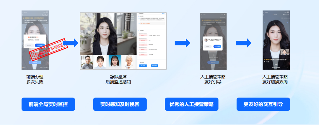 但受业务复杂程度、个人认知差异、现有技术水平等多方面因素影响,大多数金融机构的自助服务场景都在不同程度上存在着因用户对引导话术理解不到位、操作不规范、系统智能识别效果差等问题,导致出现业务办理流程受阻,甚至是业务办理失败的现象。