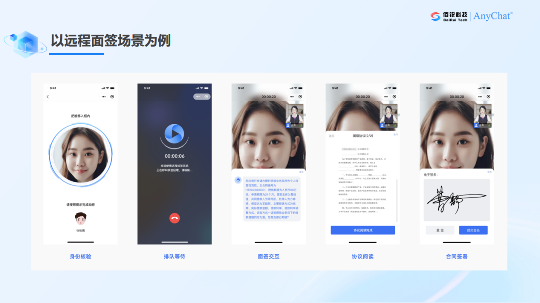 依托对数字人技术的研究积累,AnyChat将全新引擎数字人融入远程视频银行产品中,综合应用语义理解、多轮交互、大数据、生物识别等技术手段,全面提升虚拟数字人的视、触、听、说等多模态感知交互能力,为客户提供从咨询到引导、再到办理的旅程陪伴式服务,赋能业务导航、数字人客服等场景体验升级,满足不同银行推动远程金融服务的“智能进化”的个性化需求。