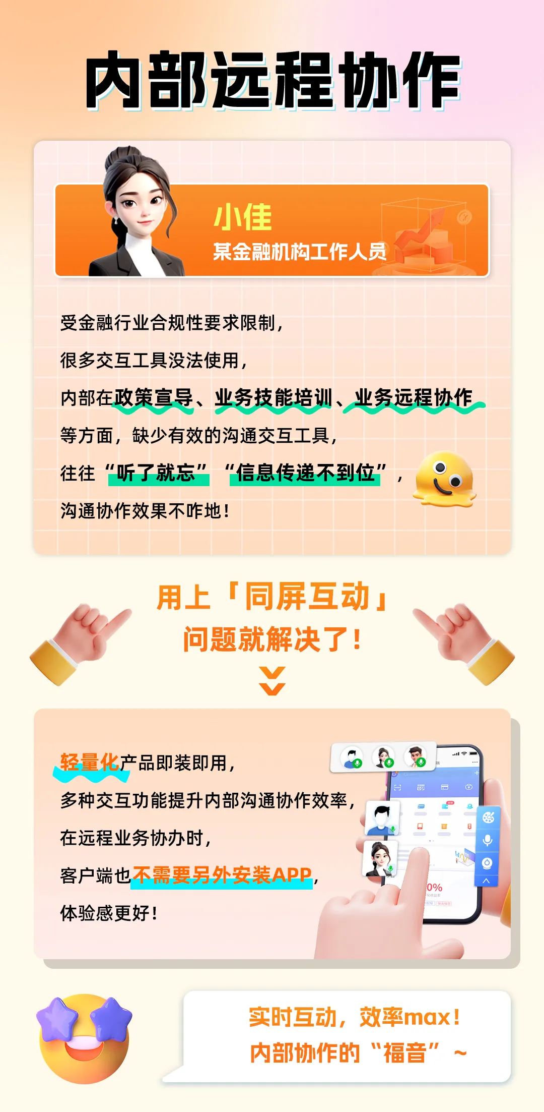 ● 在业务远程协办、政策宣导、技能培训等内部场景中,缺少高效趁手的线上交互工具,沟通成本高,效率难以提升;