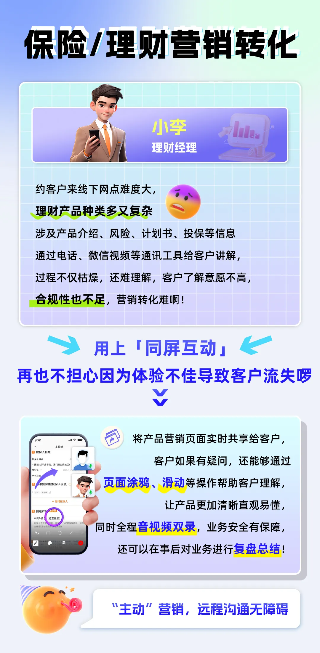 ● 保险、理财等产品复杂难懂,受限于线上营销工具不足,投资者理解困难,营销转化效果差;