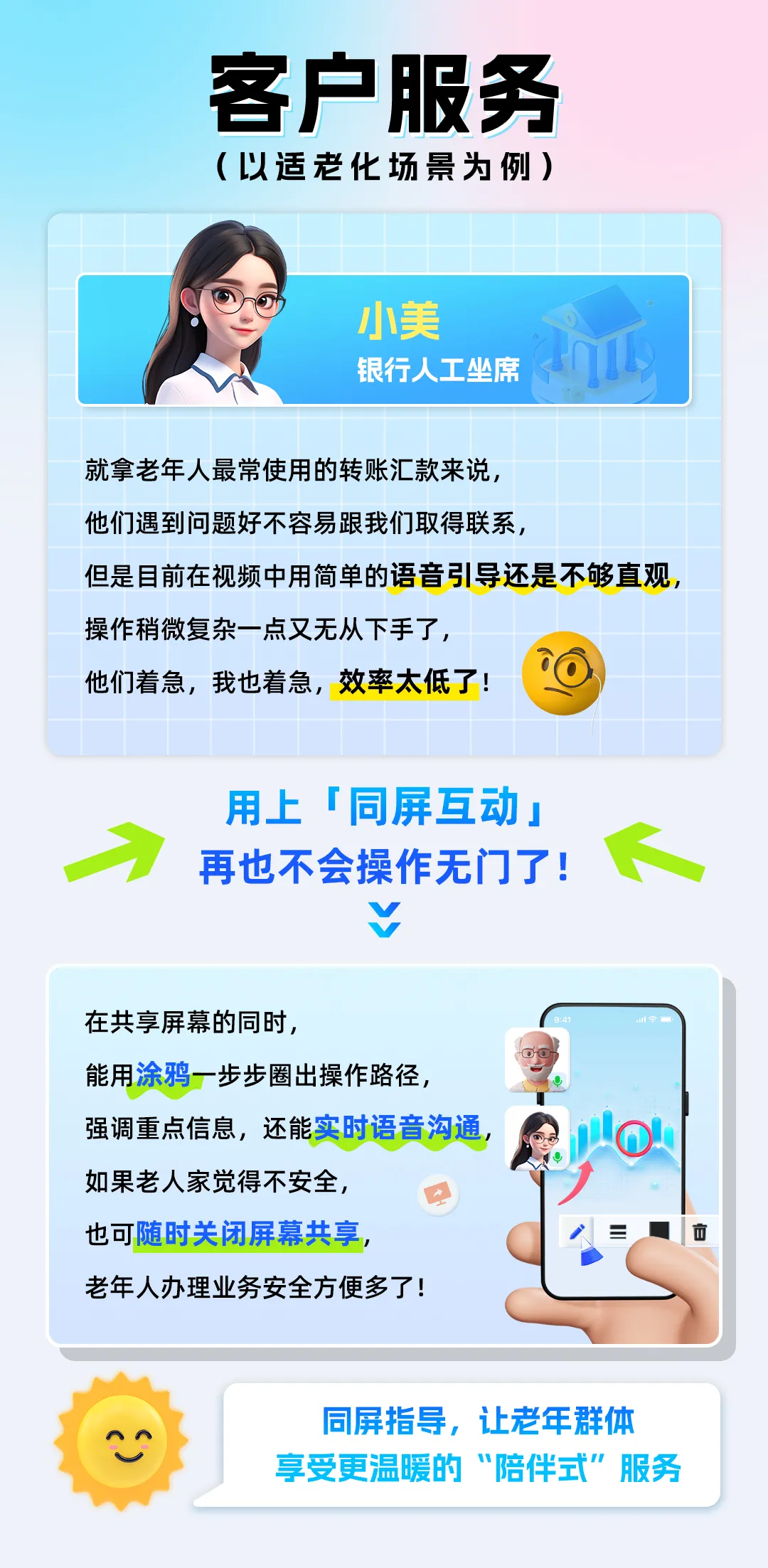 ● 客户(特别是老年客群)在自助办理业务时遇到问题,仅仅通过语音指导很难做到“对症下药”;