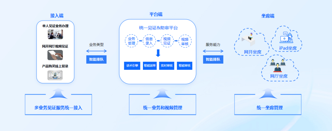 见证业务类型多样,不同业务系统之间独立建设、独立运行,坐席的见证工作割裂,忙闲不均现象严重,且无法跨业务系统实现坐席资源统一管理;