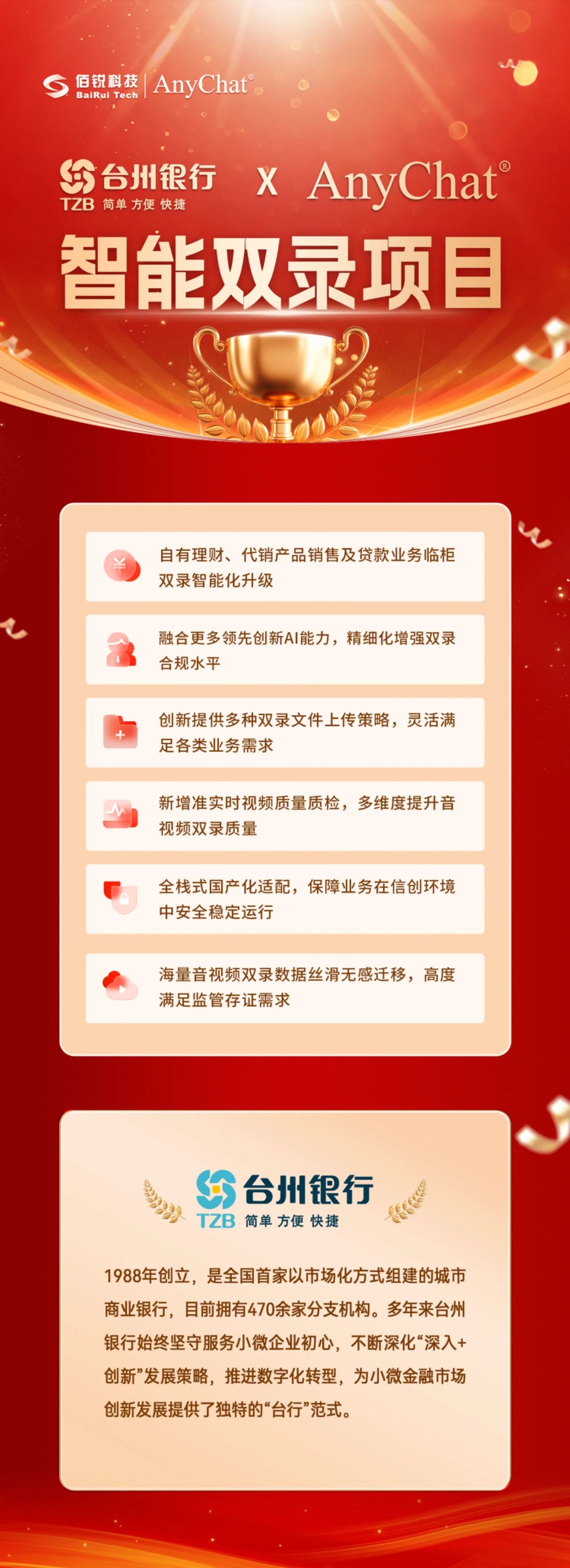 AnyChat中标台州银行智能双录项目,助推全面构建智能化金融服务体系!