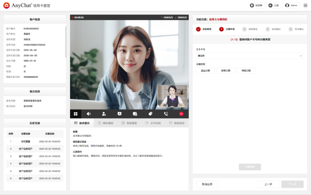 以“远程面签”产品为核心,AnyChat为银行信用卡转变经营策略打造信用卡面签解决方案,应用智能识别、智能核身、智能交互、智能审核等功能,实现持卡用户通过手机、Pad、PC等渠道与银行柜员进行远程视频通话,即可快速完成信用卡激活、分期等用卡需求,全面提升信用卡业务的风控能力与服务能力,在存量竞争下促进信用卡业务增长。