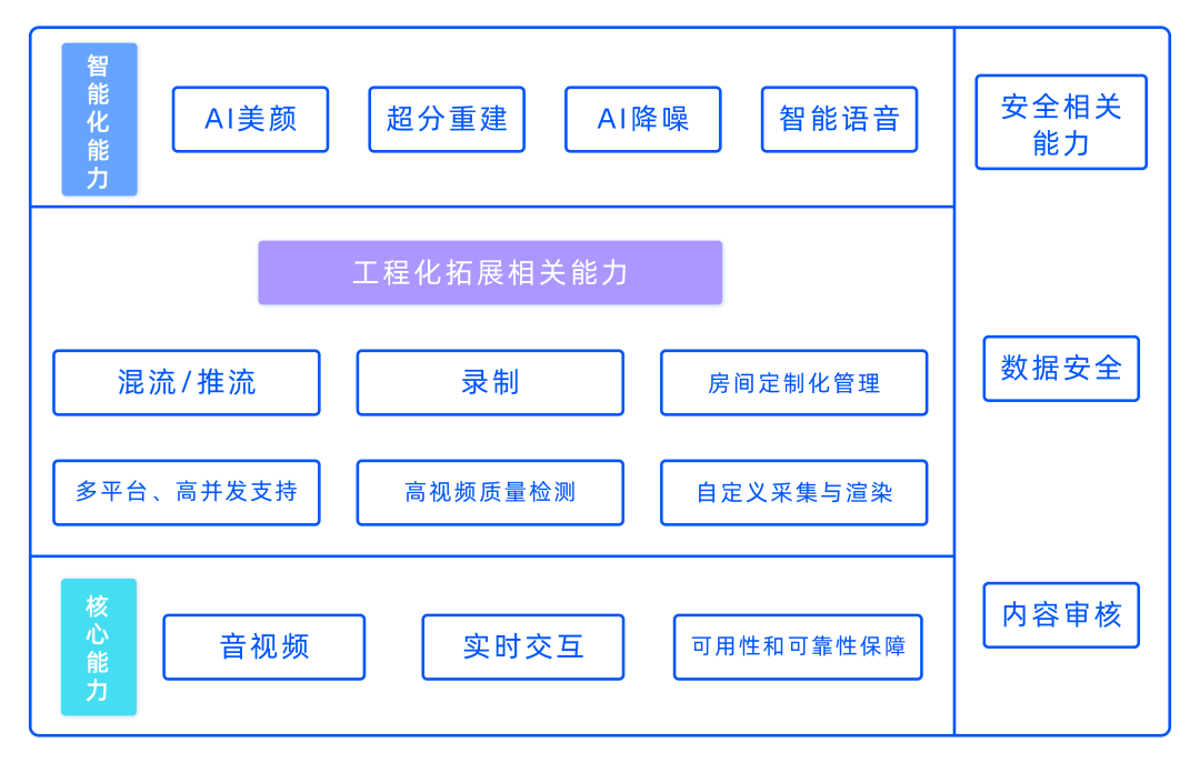 实时音视频通信通常提供PaaS层能力,以SDK、API等形式为各个业务场景提供实时通信的支撑,其可划分为核心能力、工程化扩展相关能力、智能化能力、 安全相关能力等。