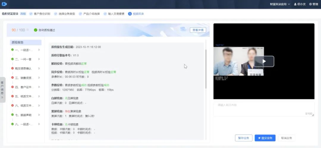 特别在临柜双录场景中,通过视频质量质检这一准实时质检方式,能够在客户还未离开银行网点时,判断双录音视频文件是否符合监管合规要求,若有问题及时整改或补录,避免往返重录的情况发生,实现在降低双录音视频合规性审核成本的同时,极大提升客户体验和财富双录的成功率。
