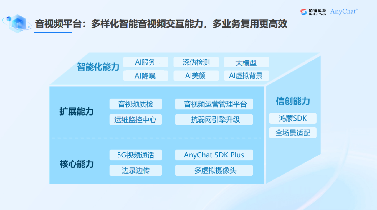 首创“AI+音视频”融合方案,在音视频架构基础上,创造性引入AI能力服务,实现一个平台管理两大能力,并提供包括AI能力管理、全链路监控、统一接入接口、能力360°自检等功能,满足银行对于AI能力的统一管理、快速接入、运维监控等业务诉求;